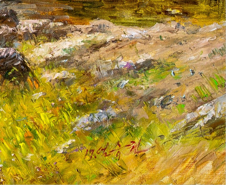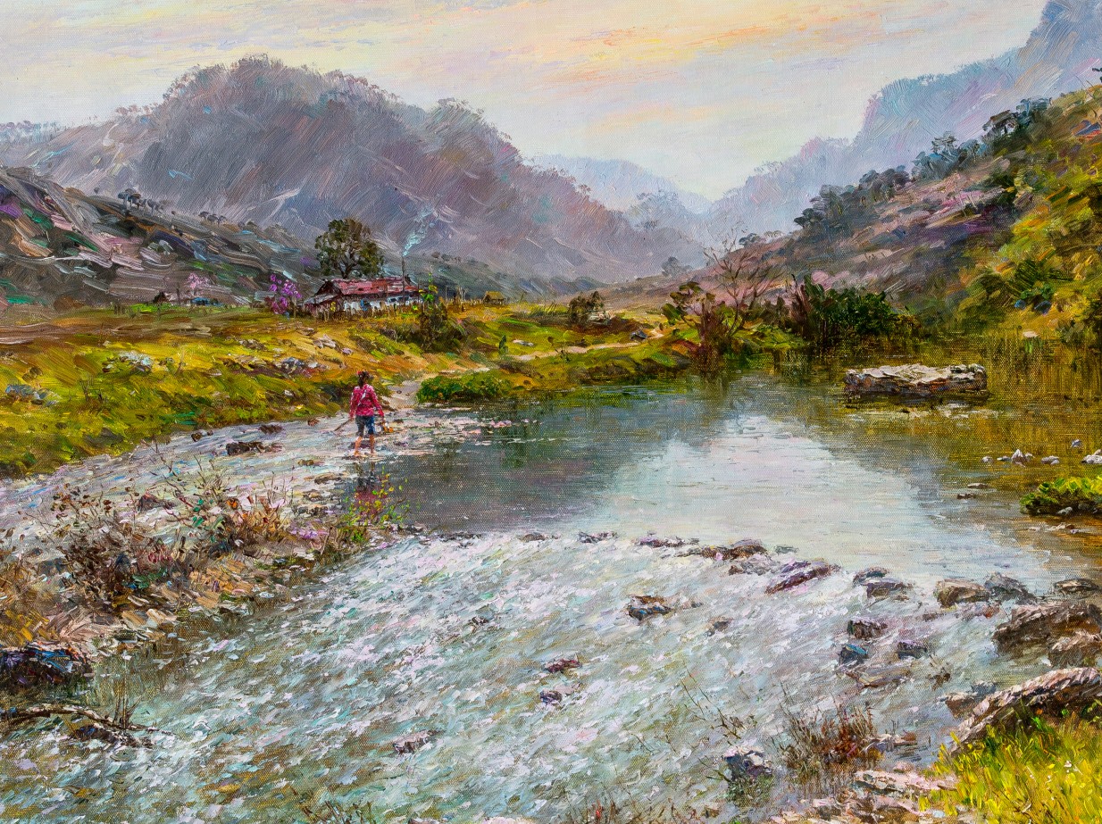 田園風景創(chuàng)作展現(xiàn)了朝鮮人民固有的和平愿望和寧靜心態(tài),嚴勝權的作品悠然自若,所繪的光幕風景美麗異常,淡雅清閑之風襲面而來。