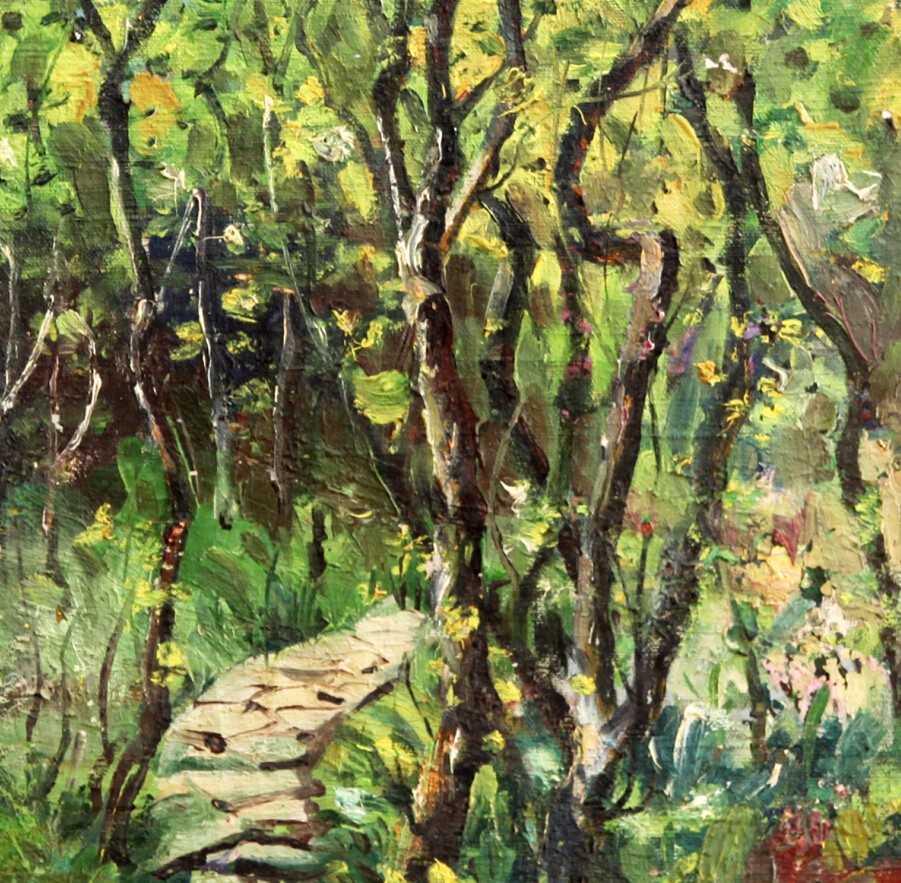 他的油畫有《野戰(zhàn)醫(yī)院》(1951年,60號(hào))、《馬》(1953年)、《修建斷橋的人民軍隊(duì)》(1953年,30號(hào))、《牡丹峰風(fēng)景》(1955年,70X63)《花》(1956年)、《我的臉》(1958年,65X50)、《爺爺》(1958年)、《牡丹》(1958年,110X100)、《兒子》(1958年,162X85)等。他的多幅油畫被朝鮮美術(shù)館收藏。