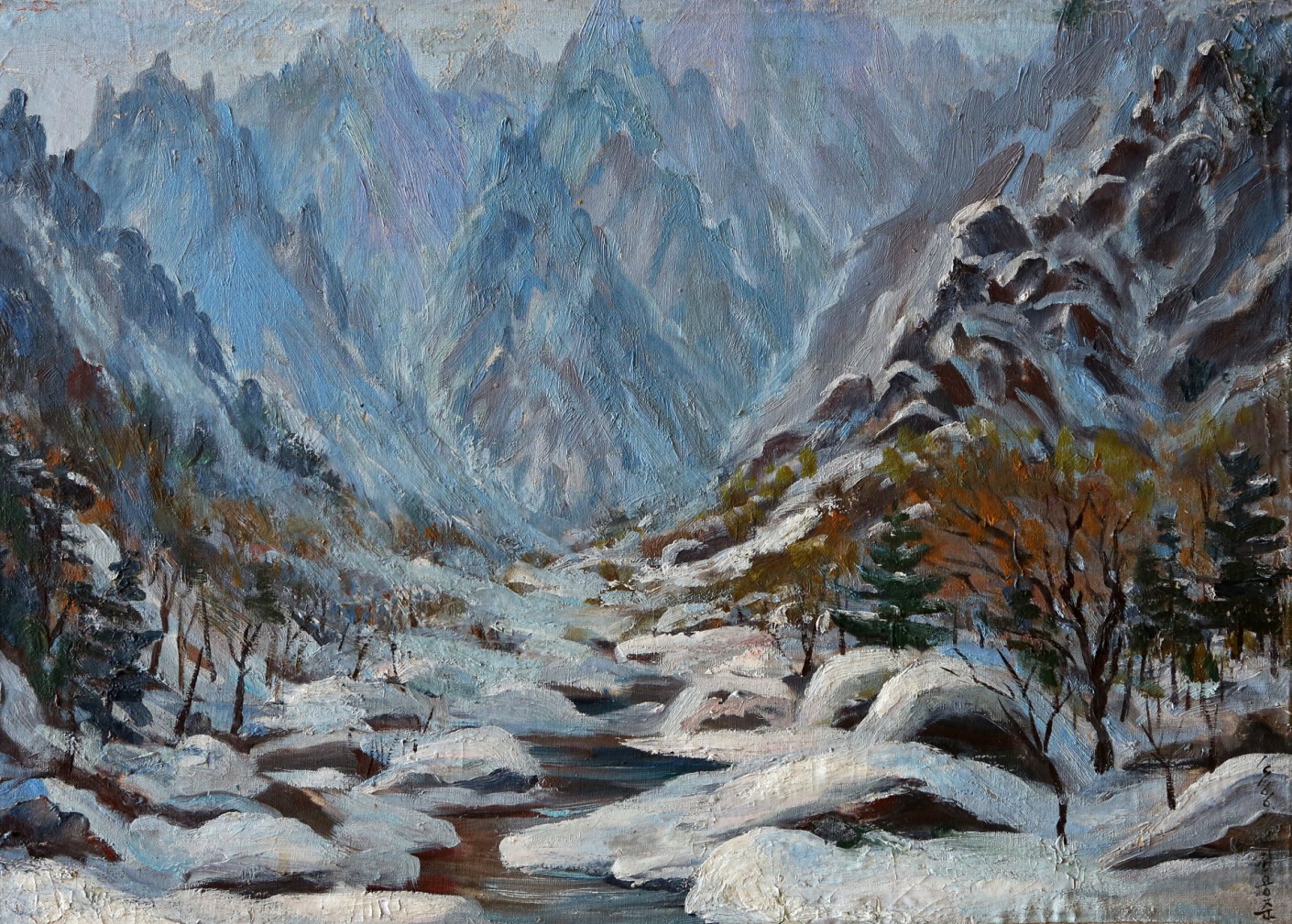 20世紀(jì)50年代后期,代表作《菊花》(1955年),《罌粟花》(1955),《舞》(1957,177x82.5cm),《妙香山》(1957),《新溪淺灘》(1957,175x69cm),《初秋》(1958,95x178cm),《玉米》(1958,95x178cm),《丹妝的大同江》(1958,59x168cm),肖像畫《偉大領(lǐng)袖金日成同志》(1959)等。