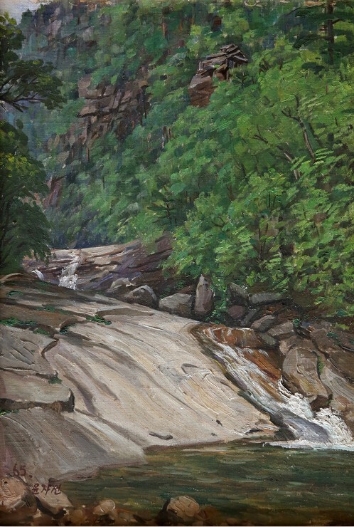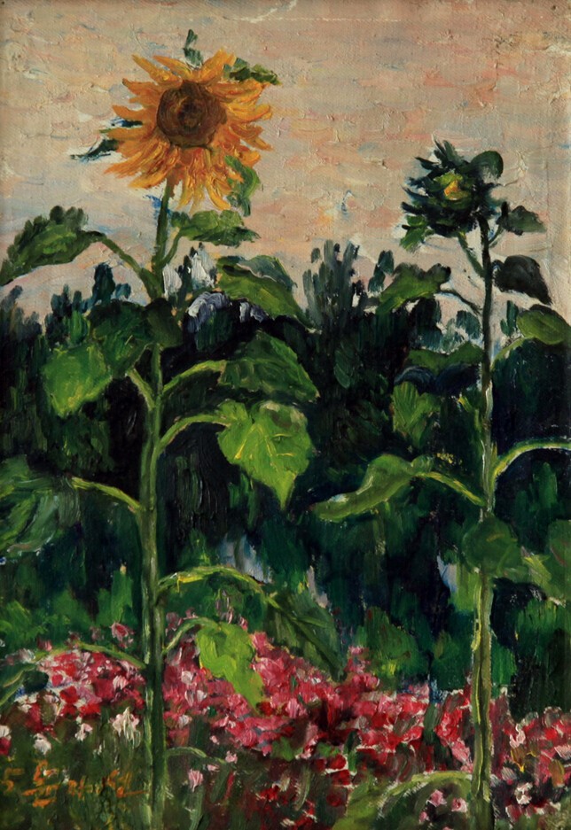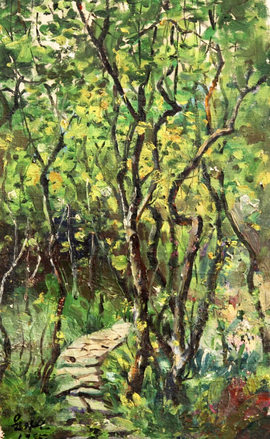 他的油畫有《野戰(zhàn)醫(yī)院》(1951年,60號)、《馬》(1953年)、《修建斷橋的人民軍隊》(1953年,30號)、《牡丹峰風景》(1955年,70X63)《花》(1956年)、《我的臉》(1958年,65X50)、《爺爺》(1958年)、《牡丹》(1958年,110X100)、《兒子》(1958年,162X85)等。他的多幅油畫被朝鮮美術館收藏。