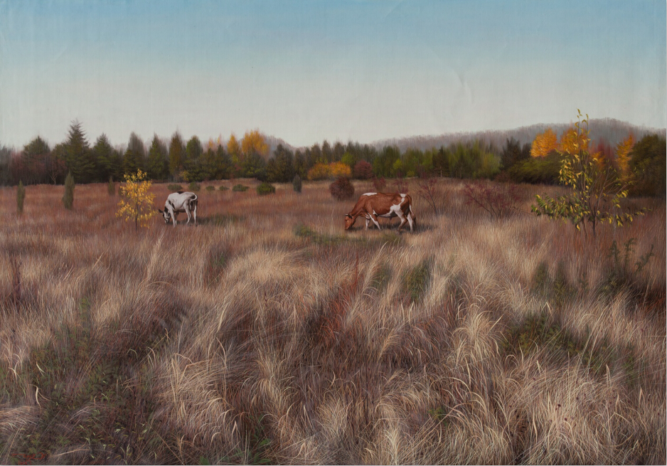 朝鮮一級(jí)畫家:李德鎮(zhèn)作品  《牧場(chǎng)》  尺幅:162*113  年代:2014年