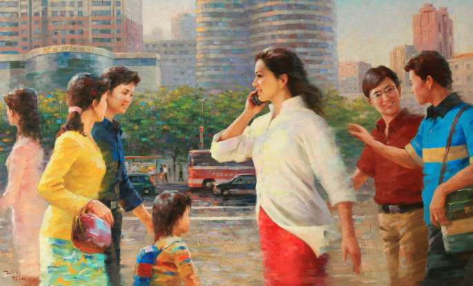 當(dāng)下朝鮮藝術(shù)躲避了全球化時(shí)代雜蕪的思維多元,也未曾遭遇圖像時(shí)代對(duì)視覺(jué)藝術(shù)的各種沖擊與滲透。雖然不能依此確切朝鮮藝術(shù)的單純之美。但是,朝鮮藝術(shù)的語(yǔ)言、文化、時(shí)代 性等等,是幾乎不與這個(gè)全球化接軌的。至少,全球藝術(shù)家所面臨的因全球化而起的諸多課題,在朝鮮藝術(shù)家那兒,都不是事兒。