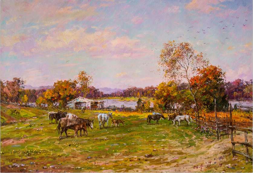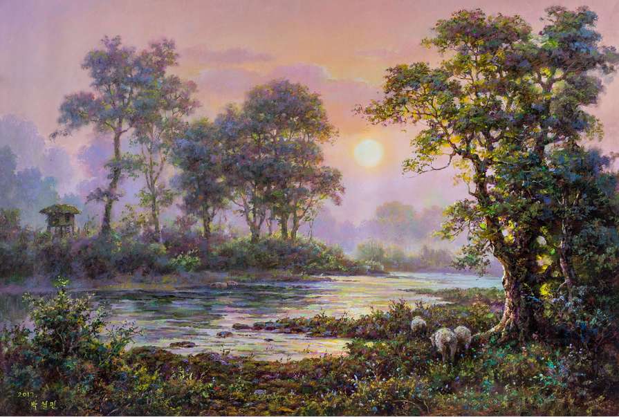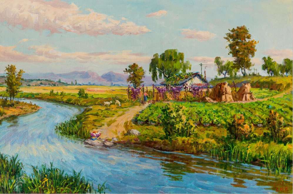 十幾年近距離觀察朝鮮藝術,感到許多名不見經傳的朝鮮風景畫家的作品,反倒有很好的藝術價值。他們中的許多畫家往往只畫些表達性情的東西,或是某種生活向往。這一類作品沒有所謂主題思想或是社會主義建設之類的宏大主題。尤其表現鄉(xiāng)村生活感受和鄉(xiāng)土記憶題材的創(chuàng)作。比如盧申賢作品,大都只表達黃海北道某一個鄉(xiāng)村的人文風情、地貌特點。反復地畫,就仿佛一生的努力都寄托在這狹小的日常之中。