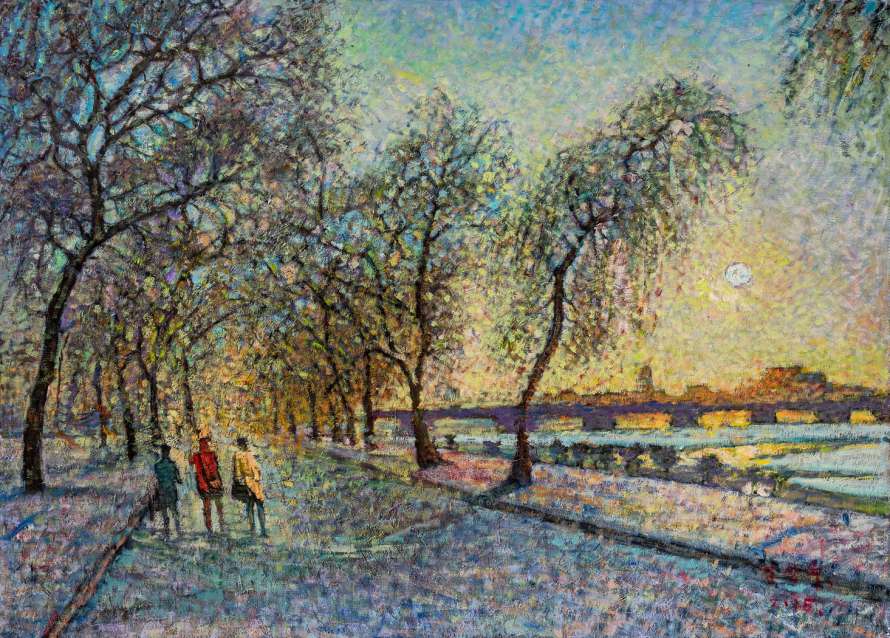 從大量風(fēng)景油畫中,我們發(fā)現(xiàn)朝鮮畫家對寂寥,空落之境心有所屬。他們試圖再現(xiàn)一種“純粹風(fēng)景語境下的無人之境”。畫面中有土路和小橋也只代表有人來過,而這一情景的終極之美,恰是人去景在,給你的是站在畫前的心靈融入,甚至幾分鐘的觀看,不僅心神安寧,甚至步入畫面。這種“物我兩忘”的山水體驗(yàn)、風(fēng)景體驗(yàn),實(shí)際上呈現(xiàn)了道禪境界的追求,是傳統(tǒng)山水畫永恒的追求,這一角度,是朝鮮油畫民族文化背景下的取向。