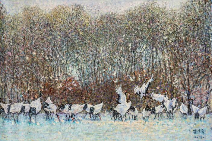 如上所述,當(dāng)下朝鮮的歷史語(yǔ)境、社會(huì)語(yǔ)境被朝鮮藝術(shù)所詮釋。并且在一九五三年以來(lái)的漫長(zhǎng)時(shí)空中自說(shuō)自話(huà)、自力更生?,F(xiàn)在其走出國(guó)門(mén),正式進(jìn)入全球第二大藝術(shù)品市場(chǎng)之后,的確驟然凸顯時(shí)空錯(cuò)位的現(xiàn)實(shí),如何理解朝鮮藝術(shù)與當(dāng)下世界藝術(shù)的發(fā)展錯(cuò)位,實(shí)際上拷問(wèn)了第二大藝術(shù)品市場(chǎng)的國(guó)際化程度和大國(guó)情懷。顯然,不聞不問(wèn),任其自生自滅或集體失語(yǔ)是不對(duì)的。盡管我們知曉“任何藝術(shù)史的書(shū)寫(xiě)始終都會(huì)從某種立場(chǎng)和視角出發(fā)”(毛娟語(yǔ)),卻仍未將六十多年以來(lái)的朝鮮藝術(shù)發(fā)展歷程,實(shí)施文化考察或歷史觀看。藝術(shù)需要接地氣兒,幾乎沒(méi)有藝術(shù)品市場(chǎng)的朝鮮恰好有這么多能夠接地氣兒的藝術(shù)家。他們創(chuàng)作著接地氣兒的作品。他們并不知道這些作品的市場(chǎng)未來(lái)會(huì)在哪里,會(huì)帶來(lái)多大的金錢(qián)收益。但他們努力在無(wú)法疏離的社會(huì)語(yǔ)境中實(shí)現(xiàn)藝術(shù)理想。意識(shí)形態(tài)雖然讓其必須為社會(huì)主義建設(shè)歌功頌德,但藝術(shù)天分讓他們以自己的語(yǔ)言方式完成藝術(shù)民族化的進(jìn)程。雖然當(dāng)下只有中國(guó)藝術(shù)品市場(chǎng)在嘗試接受來(lái)自半島以北的繪畫(huà)藝術(shù),但朝鮮藝術(shù)能夠走出國(guó)門(mén),能展示于全球第二大藝術(shù)品市場(chǎng),并被許許多多藏家購(gòu)藏,其實(shí)已經(jīng)預(yù)示著離開(kāi)中國(guó),“再?lài)?guó)際化”的可能。
