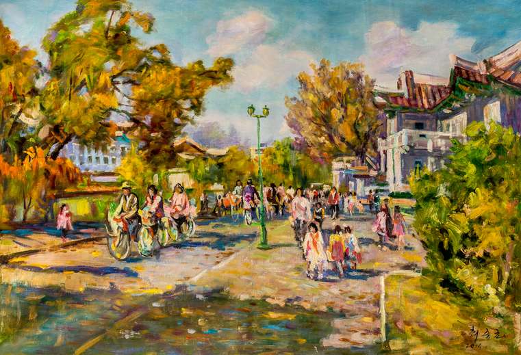 在亞洲,油畫作為外來畫種,都經(jīng)歷了不同程度本土化的努力和進程。這個過程呈現(xiàn)開放性和封閉性兩種路徑,比如日本油畫,無論本土化程度如何,但開放性貫穿始終。比如中國,有開放性的過程也有封閉性的年代。具體到朝鮮油畫,其當(dāng)代部分,也既朝鮮建國至今的七十年里,應(yīng)該說基本上處于一個相對封閉狀態(tài)下的、或者說有限的選擇性的交流背景下的油畫本土化的歷史進程。