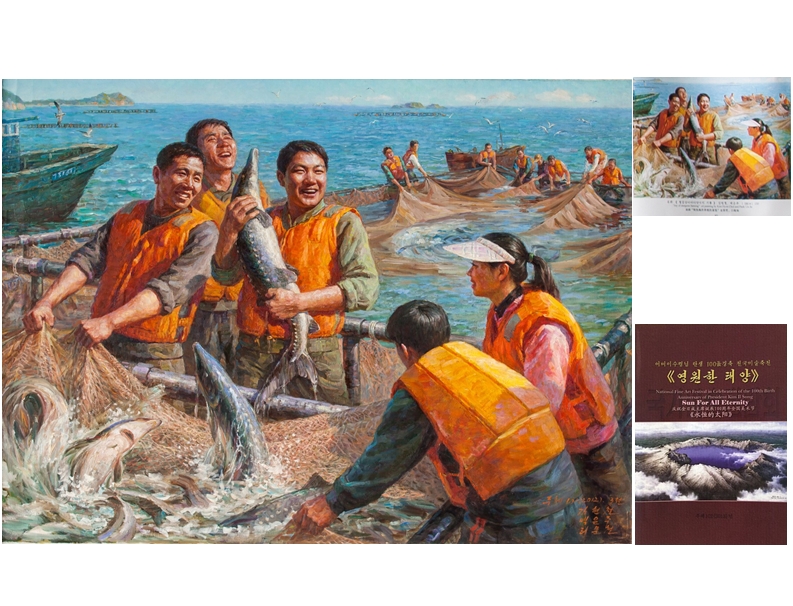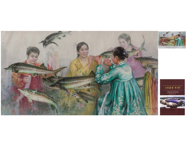 • 畫家姓名:金賢哲、白銀珠 畫名:《鱘魚海洋養(yǎng)殖的喜悅》 尺幅:158x115(cm) 年代:2012年