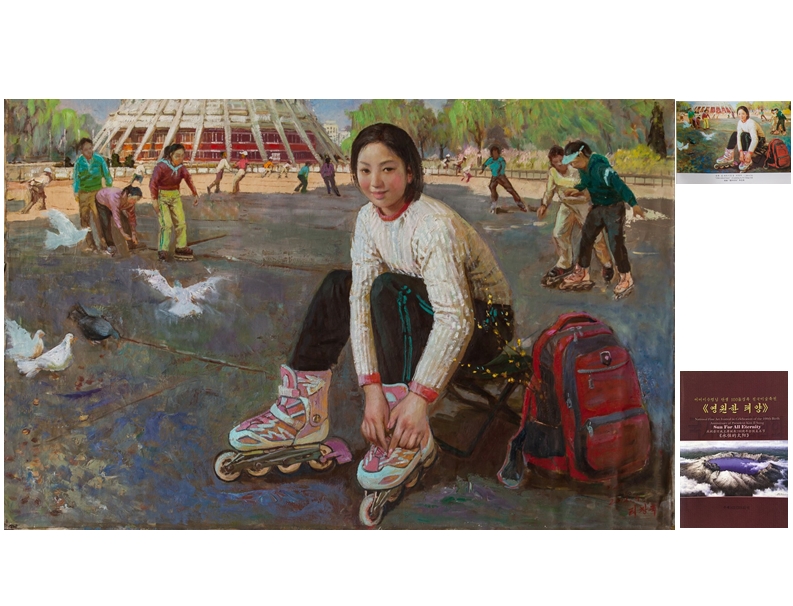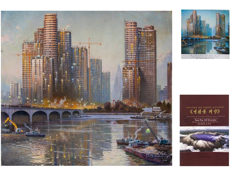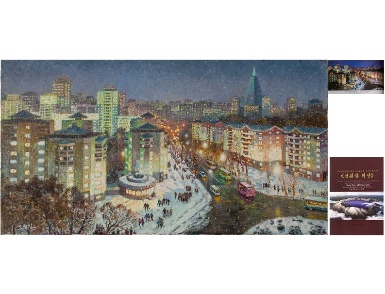 • 畫家姓名:任武才 畫名:《日新月異的平壤的早晨》 尺幅: 196x106(cm) 年代:2012年