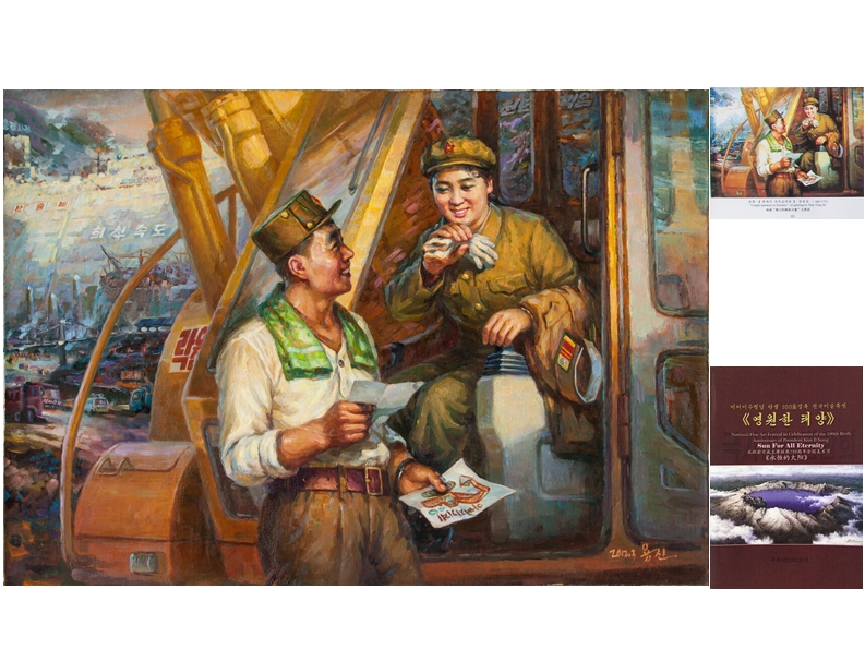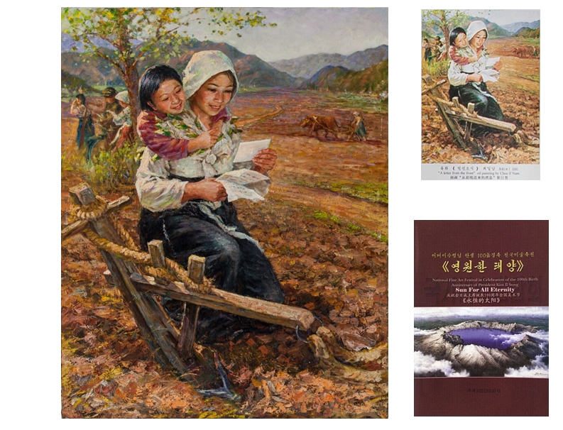 • 畫家姓名:李勇男 畫名:《金日成將軍送來的?!烦叻?52x103(cm) 年代:2012年